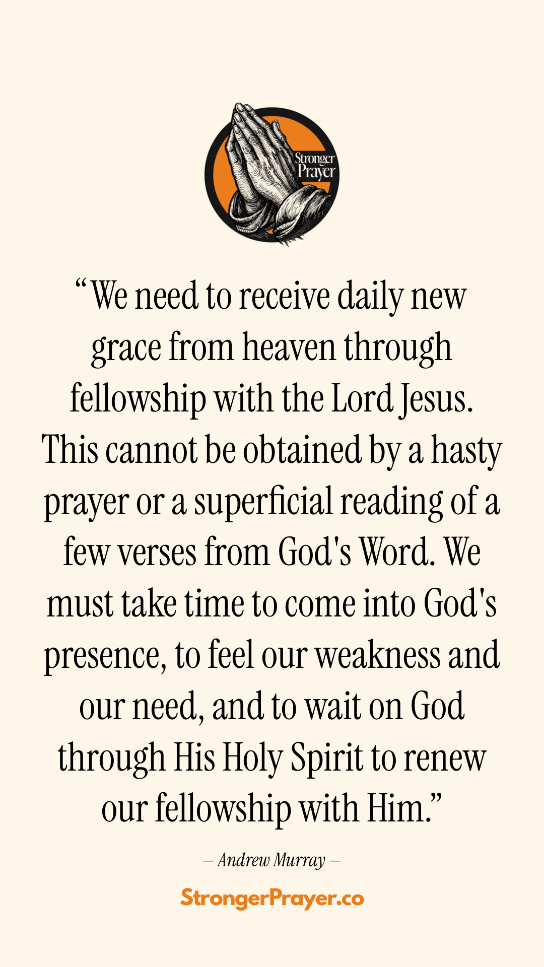 “We need to receive daily new grace from heaven through fellowship with the Lord Jesus. This cannot be obtained by a hasty prayer or a superficial reading of a few verses from God’s Word. We must take time to come into God’s presence, to feel our weakness and our need, and to wait on God through His Holy Spirit to renew our fellowship with Him.” — Andrew Murray
